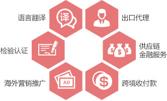 针对一带一路沿线国家的外贸配套服务,涉及出口代理,语言翻译,营销推广,产品认证,跨境收付款等。